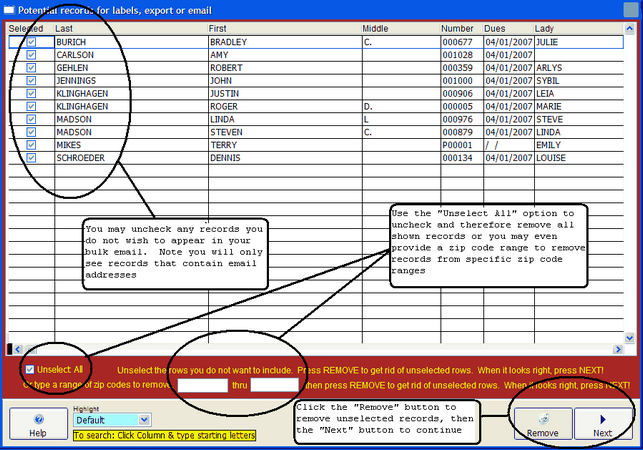 You will presented with a list of all records containing an email address, you can choose to send bulk emails to all of these records or you may uncheck unwanted records. Another handy feature is to select a zip code range to exclude from your bulk email. Click the "Remove" button once you have made all your changes, then click the "Next" button to proceed to the next step.