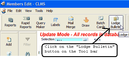 On the tool bar located at the top of the "Members Edit" screen click on the "Lodge Bulletin" button.