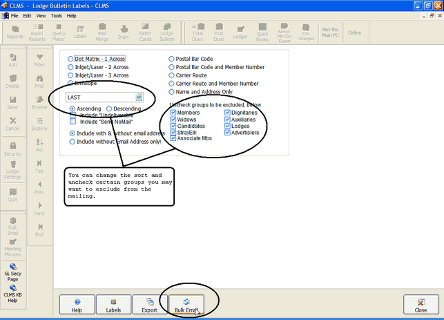 A sceen will appear that is similar to the one you might see when preparing to send labels. Highlighted below are the two main options that are applicable to "Bulk Emails". You can change the sort which will determine the order the email addresses will be listed in and you can choose to exclude specific groups so that they are not list in the BCC blind carbon copy list. Click the "Bulk Email" button to continue.