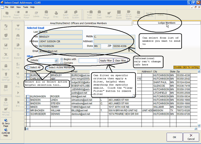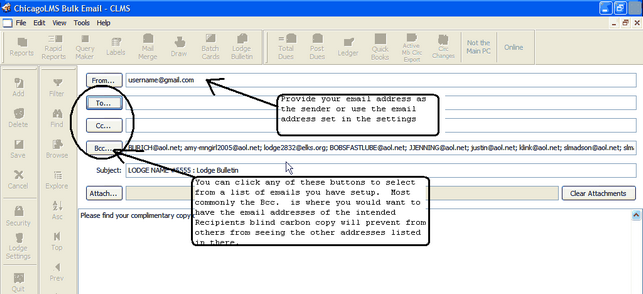 You will see two Tabs "Lodge Members" and "Area/State/District Officers and Committee Members" **(information from this tab must be manually maintained). "Lodge Members" tab will contain email information from the "Ph/email" tab of the "Members Edit" screen for each member. Note that the Bcc... line is automatically populated with email addresses. If you wish to customize then you will have to delete the automatically supplied email addresses then click on the "Bcc..." button to select criteria for this mailing.