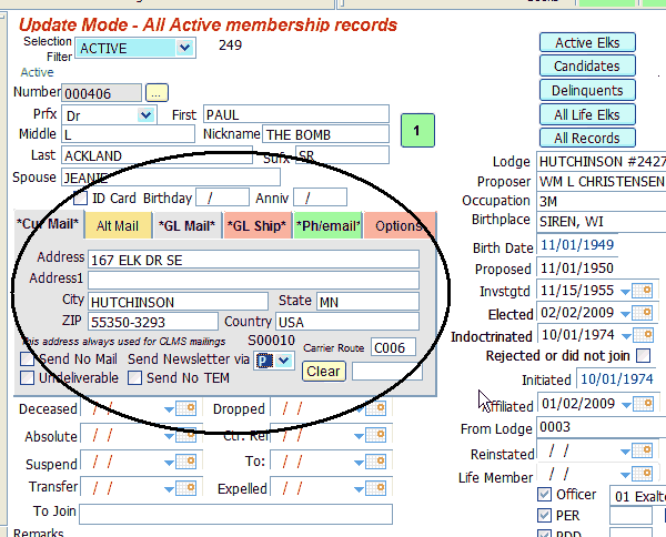 Here is an example page frame from the "Members Edit" screen, the various mail/contact and options tabs