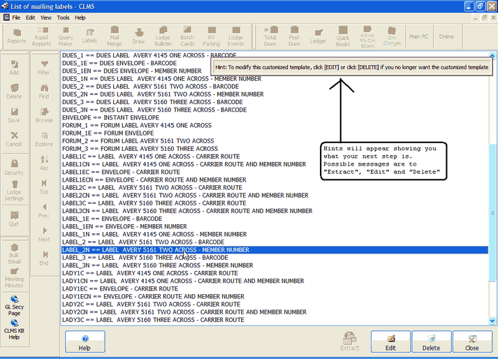 Locate the report, label or membership card you wish to modify. For this example we have chosen to edit the "BITHELK" template which is the report for active elks birthdays for a specified month. Upon selecting this or any report you will immediately see a hint box specifying what you need to do to Edit the report.