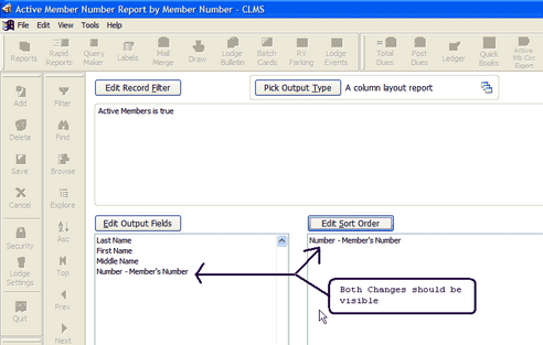 Now we will change the sort order of the output. We want the list to show up in member number order so that it will be easy to determine the highest membership number or even to scan for any gaps in member number sequence. Click the "Edit Sort Order" button.