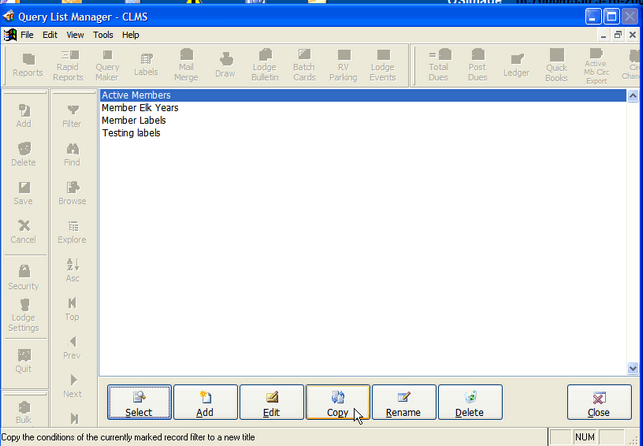Lets make a copy of the "Active Members" query so that we can examine this queries's options and make changes to the copy without effecting the original query. Using your mouse select the "Active Members" query from the list then click the "Copy" button from the tool bar at the bottom of the screen.