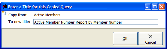 In the "Enter a Title for this Copied Query" popup window enter a new name for the query the "To new title:" text box. We are calling this new query "Active Member Number Report by Member Number" a descriptive name.
