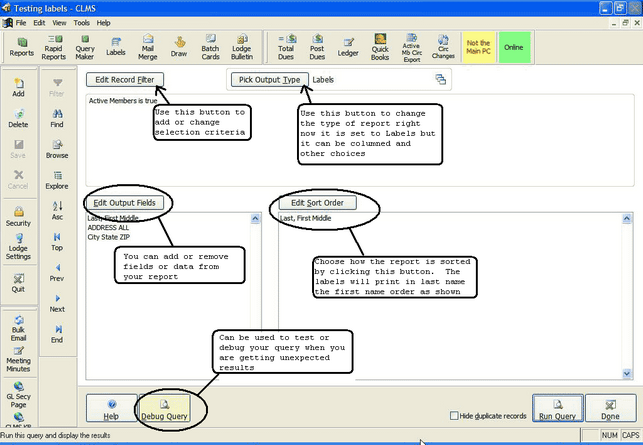 IMPORTANT: Query Maker works more like a report writer in that it each query is specific to the report that you create for it. Make sure to name your queries using descriptive meaningful names. An example would be creating a membership number list sorted by member number to be viewed on screen or printed, you may want to call this report something like "Member number Report by Member number".