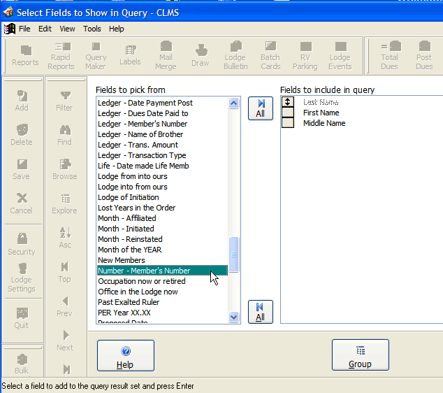 First lets add the member number to the output start by clicking the "Edit Output Fields", button. Then locate the "Number - Member's Number" from the Fields to pick from list on the left hand side of this form. Once you have located this field you can add it to the out put by double clicking on the field. It should then appear in the column on the right "Fields to include in query". Similarly you can double click on a field from the "Fields to include in query" list to remove a field from the query.