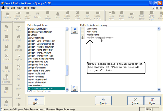 The member number will now appear at the bottom of the right hand list called "Fields to include in query". Click the "Done" button once you have finished adding any additional fields you want to have included. You will be returned to the previous screen.