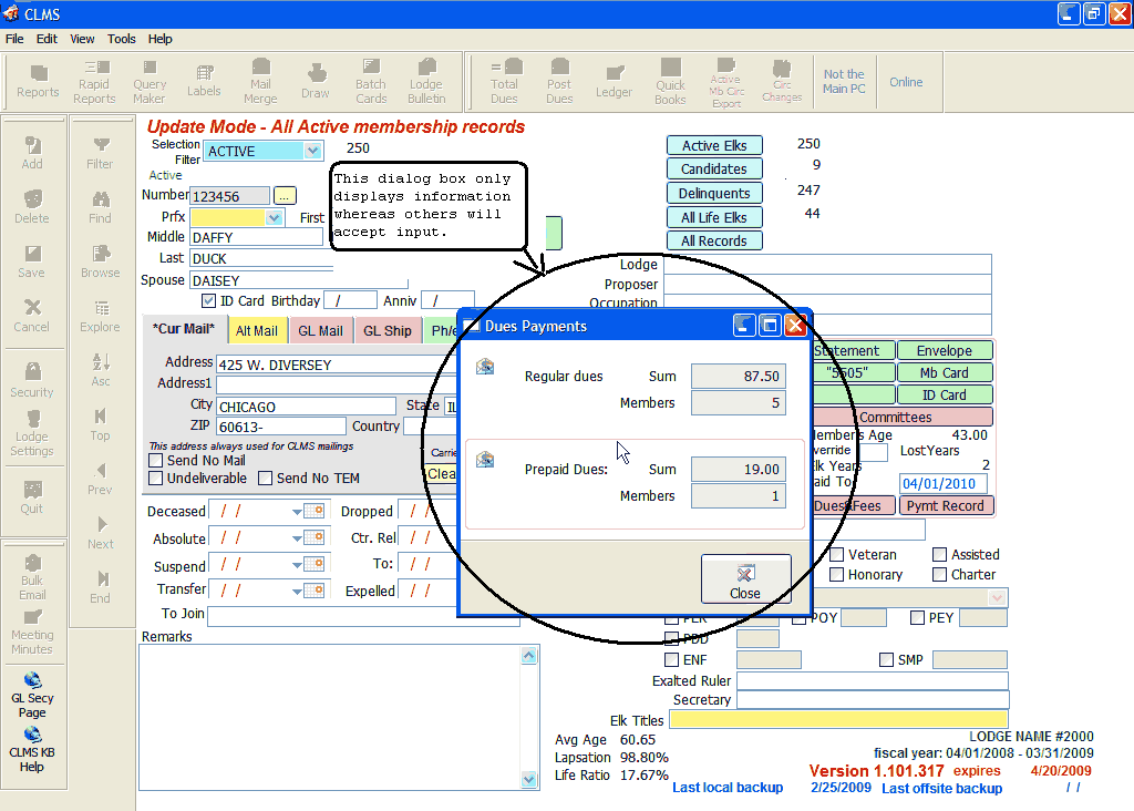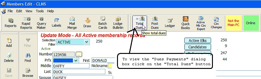A dialog box is a screen that requests input or presents information. To view the "Dues Payments" dialog box click on the "Total Dues" button from the upper tool bar.