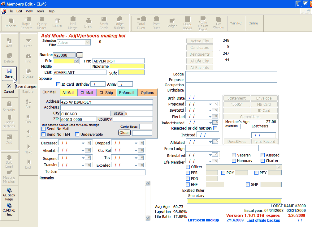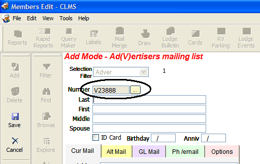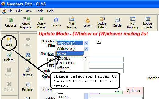 CLMS provides a lodge record type so that you can record lodge information for other lodges within the organization. Follow the steps below for "Adding An Advertiser Record"