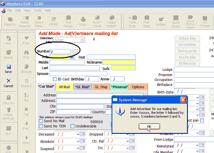 | 2. | You will then get a message indicating the requirements for data to be entered in the "Advertiser's", "Number" field. The requirements for a new "Adver" record is that the number will be preceded with the letter "V" followed by a 5 digits numbers 0 through 9. The letter "V" should automatically appear in the number field. Click the "OK" button to continue. |