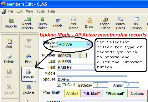 To limit the records you have to browse through set the "Selection Filter" to the type of records your looking for. Keep in mind that once you click the "Browse" button you will only see records of the type set on "Members Edit", "Selection Filter". Below it is set to "Active" so only active records will be viewed.
