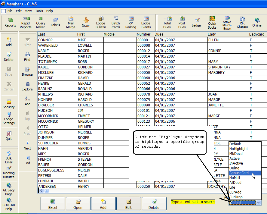 Click the "Highlight" filter to highlight specific groups of records. In the example we are looking for "Active" records that have the "Id Card" option checked off on the "Members Edit" screen. Remember the list will contain only records based on the "Filter" drop down on the "Members Edit" screen.