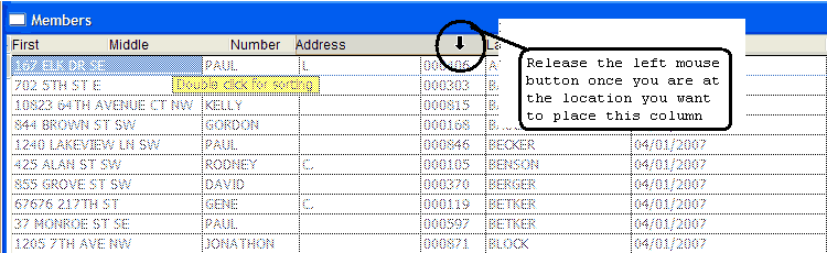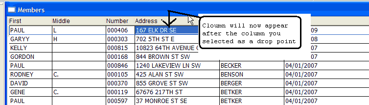 The Columns will appear to fade while holding the left mouse button down locate another column that you want to drag the selected column to the right of. In the example will we drag the Address Column to the right of the Number column.
