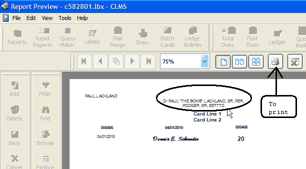 You will see a preview of your printed cards on the screen. In the example notice the titles after the name, along with any prefixes and suffixes. Click the printer icon to actually get print dialog and send to the printer.