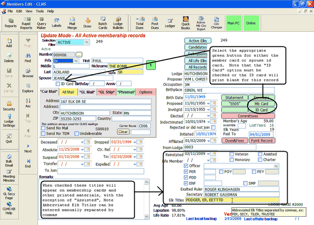 Select the desired member in the "Membership" screen and then click on the "Mb Card" or "ID Card" buttons as shown in the image below. Note Titles in the lower right hand corner of the "Members Edit" screen, these titles will appear on membership cards and other reports if checked.