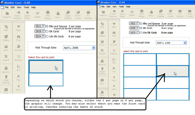 Chicago Lodge Membership System (CLMS) provides lodge secretaries the ability to print both membership cards for members and id cards for family members. CLMS has been designed to support the two most common types of stock in use by the members of the Elks, which are the 2 cards per-page and 8 cards per-page.