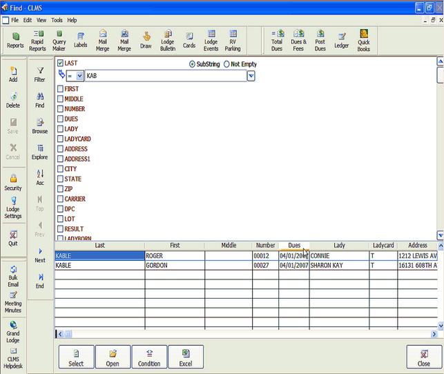 If the member you are searching for is in the list of returned matches you can select that member's record in the grid and then click the Open button to display that member in the Membership screen. Or, if you prefer, you can export the records you have selected to Excel for further processing, viewing and use.