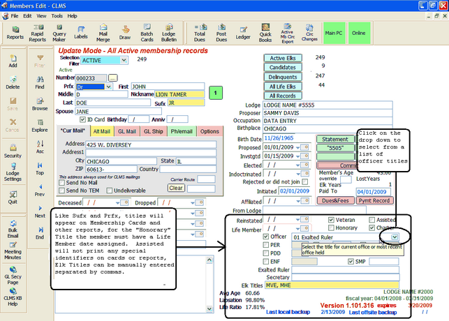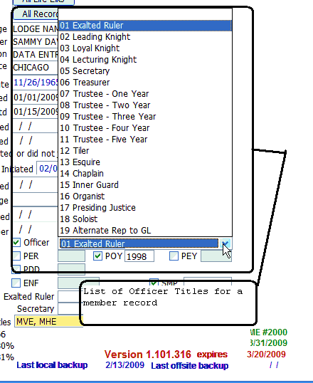 Note that if you check the "Officer" check box you will need to select a title from the "drop down" list to the right of this check box. Titles available are Veteran, Honorary, Charter, Officer (requires title selection from drop down), PER (enter year to the right), PDD (enter year to the right), ENF (enter amount to the right) and Elk Titles (manually entered).