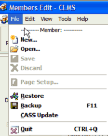 Restore - This menu option allows you to restore the CLMS should you have had a loss of data, a crash or some weird event that caused the loss of your membership data. However, this restoration of your data is possible if, and only if, you have made backups of your data on a regular basis. See Restoring Lost Data for details.