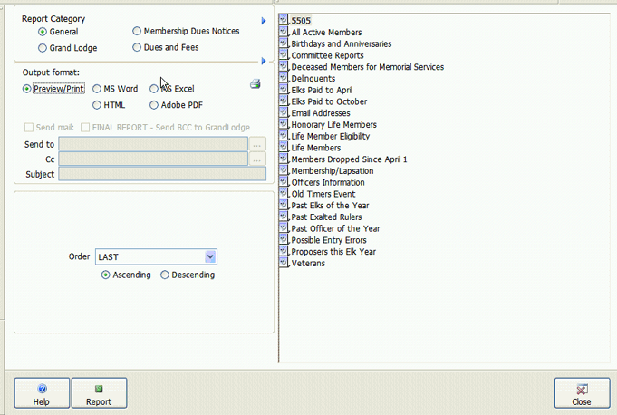 This screen allows you to preview, print, export, and email the system reports that come stock with CLMS - Chicago Lodge Membership System.