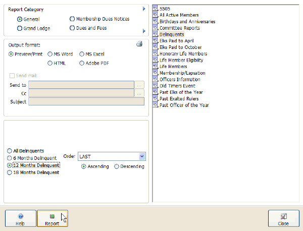 This screen allows you to preview, print, export, and email the system reports that come stock with CLMS - Chicago Lodge Membership System.