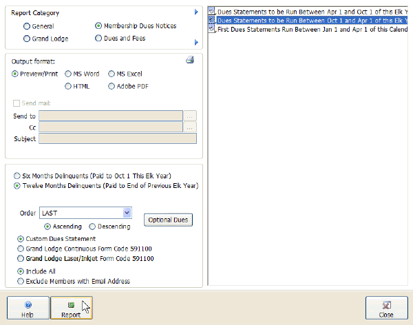 This screen allows you to preview, print, export, and email the system reports that come stock with CLMS - Chicago Lodge Membership System .