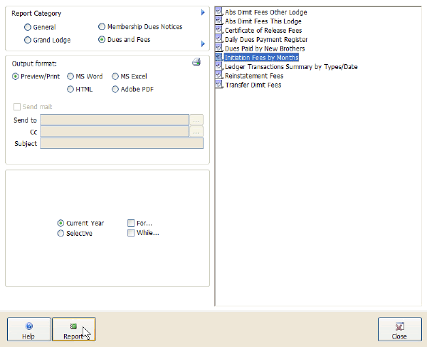 This screen allows you to preview, print, export, and email the system reports that come stock with CLMS - Chicago Lodge Membership System.