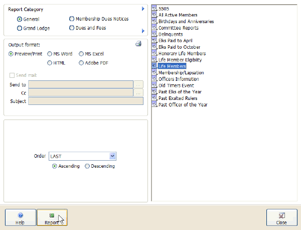 This screen allows you to preview, print, export, and email the system reports that come stock with CLMS - Chicago Lodge Membership System.