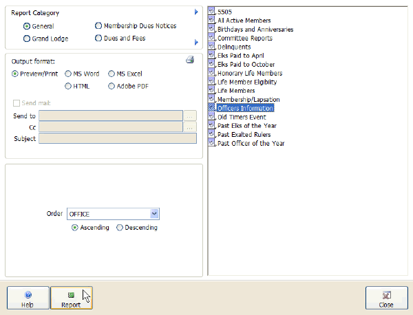 This screen allows you to preview, print, export, and email the system reports that come stock with CLMS - Chicago Lodge Membership System.