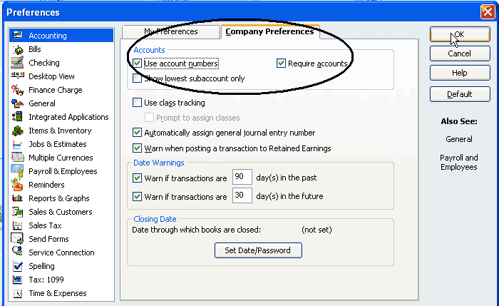 Select the "Company Preferences" tab, make sure that "Use account numbers" and "Require accounts" are checked.
