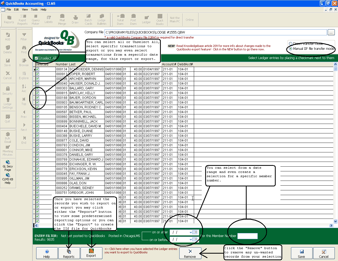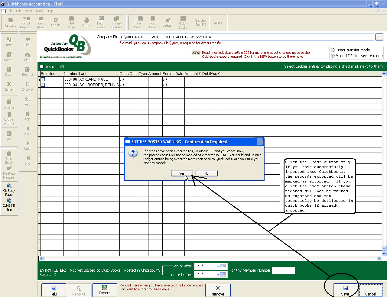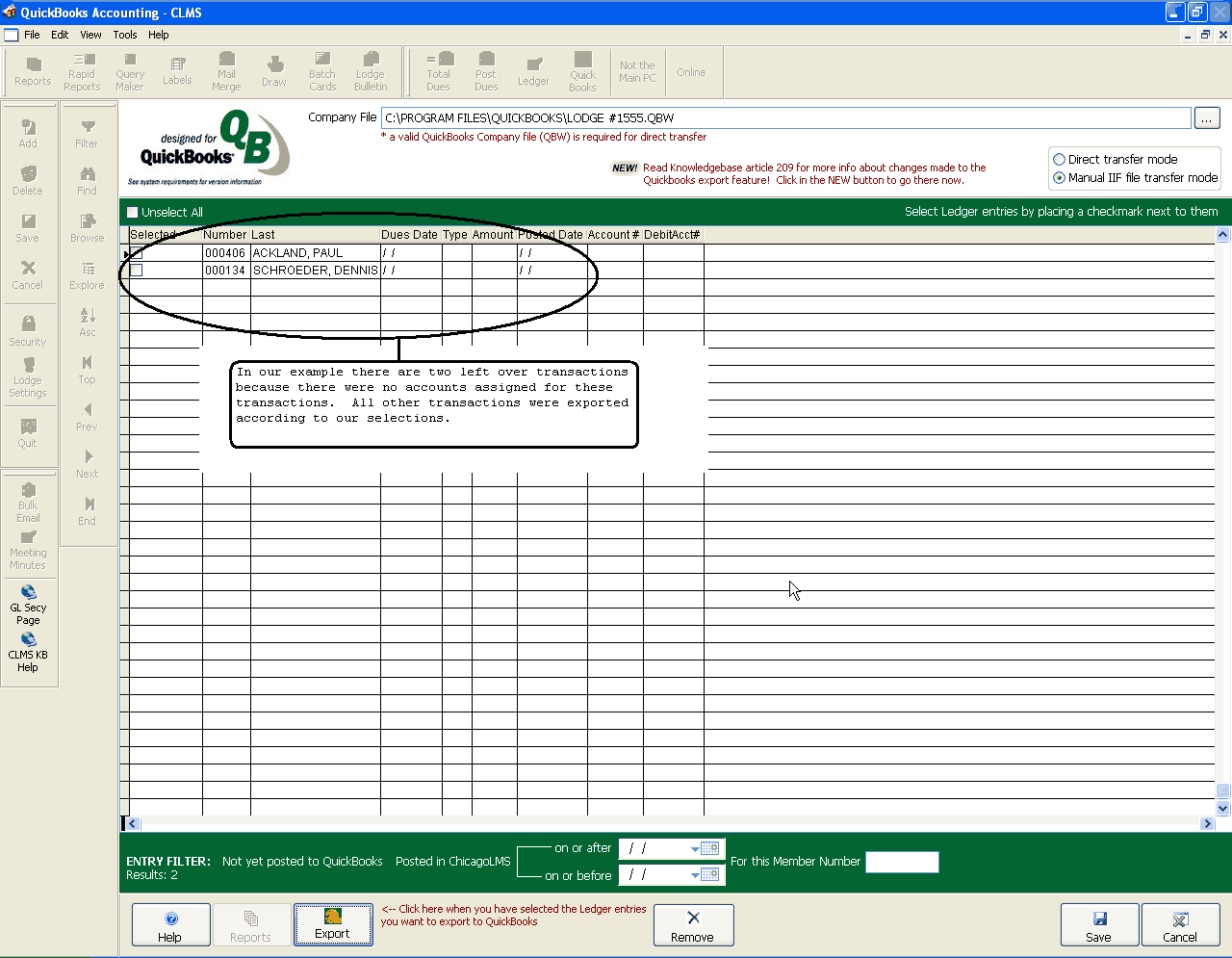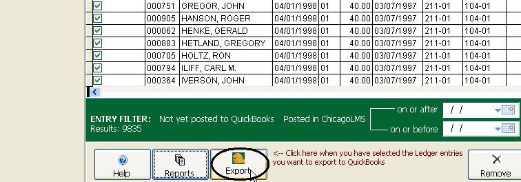 At the bottom of the screen is a 'Remove selected entries' button. This should be used with extreme caution as it will remove entries from the displayed list without actually posting them to QuickBooks. This can be useful when you don't want to ever post entries to QuickBooks that happened before a certain date for instance. In that case you would enter an 'On or before' date in the date picker at the bottom of the screen (Entry Filter area) and then check the Select All checkbox to select all of the ledger entries that occurred on or before a certain date. Then you would click on the 'Remove selected entries' button to make sure they were never displayed in the grid again. This does not actually remove the ledger entries from your CLMS - Chicago Lodge Membership System and they will still be visible from the Ledger and Payments screens. It simply marks them as exported without actually exporting them to QuickBooks so that you don't have to keep filtering those records out whenever you are creating an IIF export file for QuickBooks.