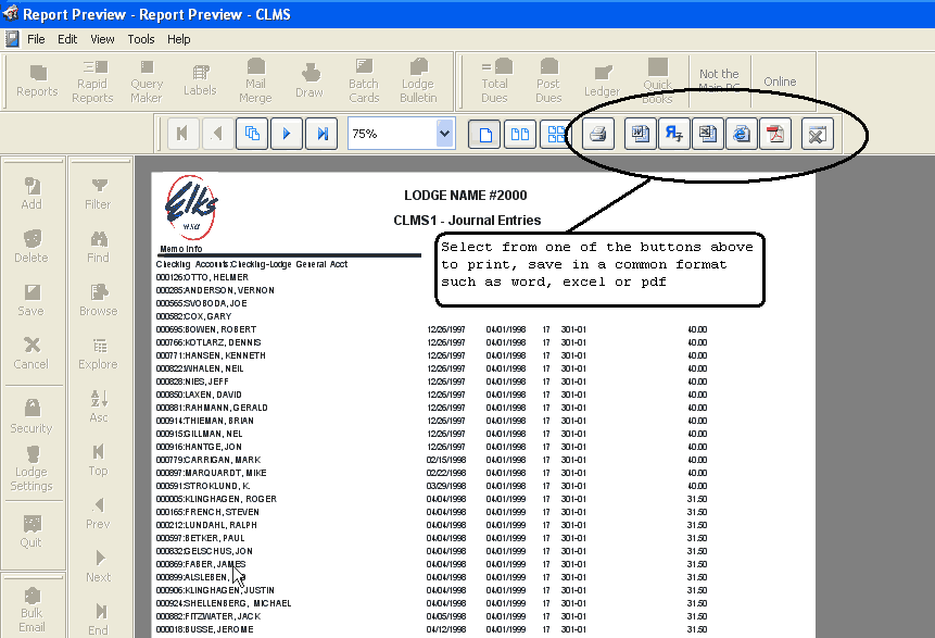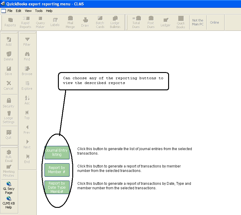| • | Click the "Reports" button to view/print a "Journal Entry", "Report by Member #" or "Report by Date Type Memb#" |