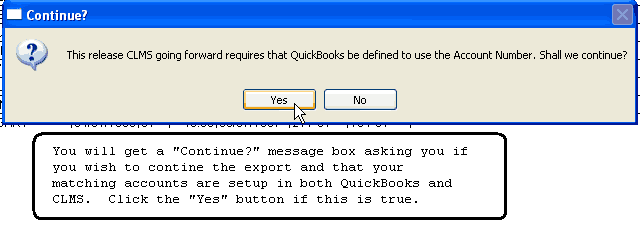 Click the "Yes" button to verify that you are sure that matching accounts are setup in both Quickbooks and CLMS. Click the "No" button if you still need to verify the accounts in either application.