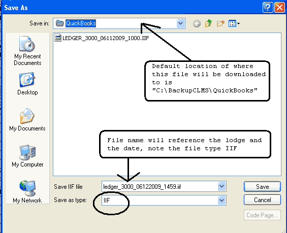 You will see a "Save As" screen to save the IIF file. The default location for saving the file is "C:\BackupCLMS\QuickBooks". The file type is set to "IIF" and you will notice that the file is named using the the lodge name, the date and military time followed by the "IIF" file extension. Click the "Save" button once your ready to save the file.