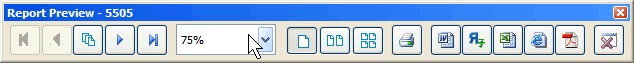 The "Print Preview" toolbar is displayed whenever report or label is previewed in the system. It provides a wide range of functionality that will allow you to navigate the pages of a report, print hard copies, change zoom level, select the number of pages displayed at a time and even export your reports to a number of popular formats such as Word, RTF, Excel, HTML and PDF. Esssentially this toolbar can be broken down into 5 separate areas: Navigation, Display, Print, Export and Close.