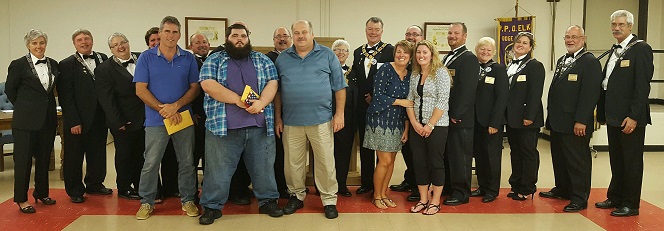 MEMBERS AND OFFICERS IN THE BACK ROW, LEFT TO RIGHT: SECRETARY, CORALEE BARRETT; TRUSTEE, BRIAN DEZELL, PAST EXAULTED RULER; ESTEEMED LOYAL KNIGHT, CARRIE DEMERS; ESTEEMED LECTURING KNIGHT, KATHY SHARP; ESTEEMED LEADING KNIGHT, KYLE SHARP; ESQUIRE, JERRY REED, PAST EXAULTED RULER; DISTRICT DEPUTY GRAND EXAULTED RULER, PHILIP ST.AMAND; EXAULTED RULER, VALERIE TESTANI; SENIOR VICE PRESIDENT, CHRISTOPHER "CHIP" GEORGE; TRUSTEE, STUART RISHE, PAST DISTRICT DEPUTY GRAND EXAULTED RULER; TRUSTEE, RICK POWELL; TRUSTEE, KAREN MADILL; CHAPLAIN, TONYA OTT; INNER GUARD, KEVIN MADILL, PAST EXAULTED RULER; AND TILER, ROBBIE MESSINA.