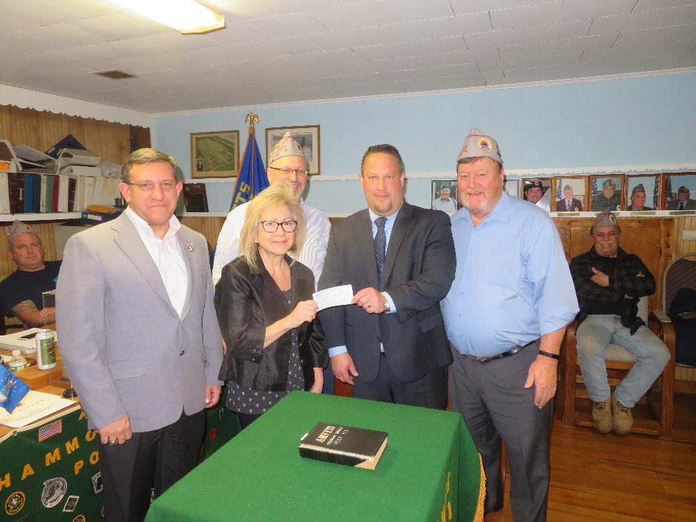 Maria Capone, who Waitresses at the Patchogue Elks social gatherings and events decided to save whatever tip money that she accumulated over a certain period and donate it to a cause to benefit Veterans. As such, she presented Sons of AMVETS Squadron 111 with a $500 check at its November meeting. Impressed with Capone’s generosity and benevolence, the Sons 111 membership voted to match her contribution and present it to the Long Island State Veterans Home at Stony Brook University in support of the Recreational Therapy Program. At the January meeting of the Sons Jonathon Spier collected the $1,000 check on behalf of the State Veterans Home.