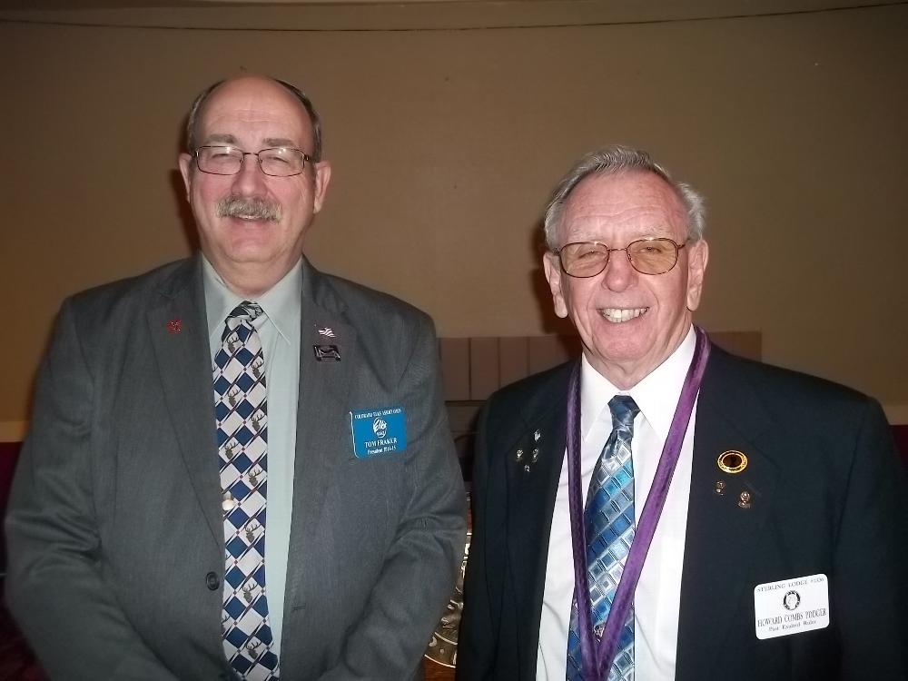 Colorado Elk's Association President visits Sterling Lodge 1336. President Fraker is on the left and PER Howard Combs is on the right.