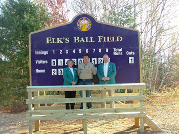 Michael Nichols (center) is pictured with Suzanne Wright and Richard Wright, PER in front of the new scoreboard at Elk's Field in Saranac Lake, New York. Michael constructed the sign as his Eagle Scout project.