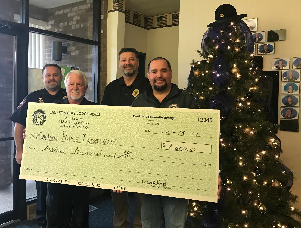 We are also proud to be able to give each and every employee of the Jackson Police Department a $50.00 gift card to Wings Etc. Thank you for all you do for our community.Police photo from leftCaptain Tony Henson, Bill Gosche Golf Committee Chairperson, Police Chief James Humphreys, Exalted Ruler Chuck Reed