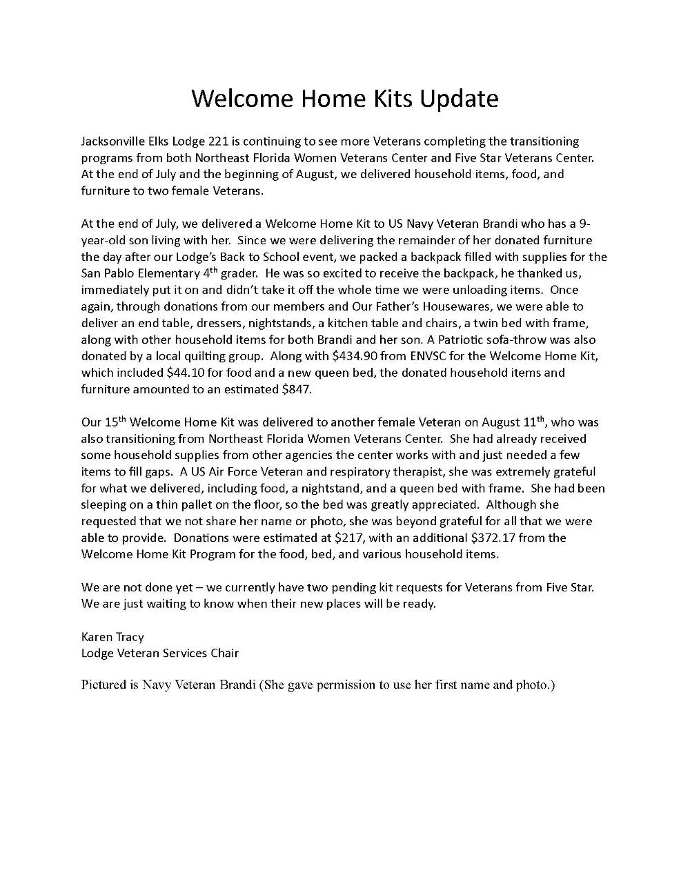 Welcome Home Kit for Veteran Brandi delivered in July/August 2024