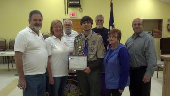 Joe LaMonica (right) and Frank Scotto (center) present Jacob Hybbeneth (center left) with donation for Eagle Scout project | March 17, 2021