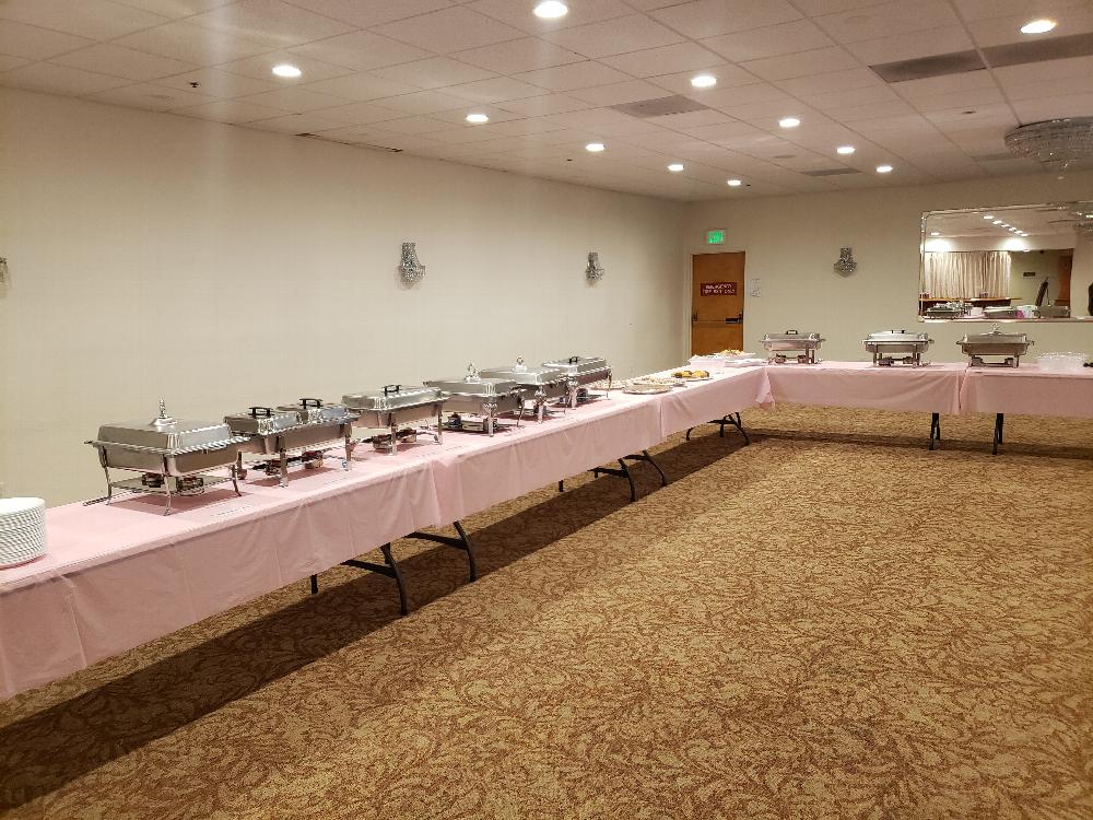 Buffet line set up, prior to all of the food being brought in.