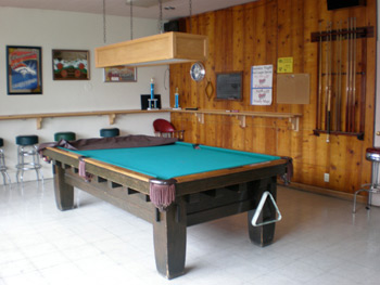Two antique Brunswick 9 foot pool tables and a dart board are available for play in two rooms next to upstairs lounge area.