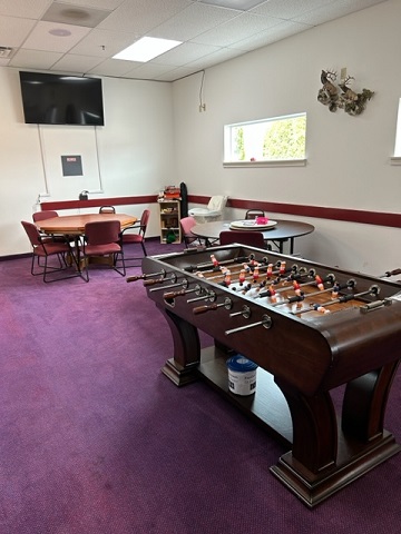 Our Lodge Room is large enough to accomodate a medium gathering. Having a capacity of 200 people, it consists of a laminate floor outlined on 2 sides with Carpet and tables that seat 6, a stage area and audio system. Additional tables and chairs are available for those events that require them.