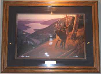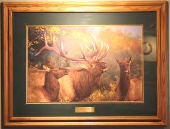 A Limited Edition Print by Bruce Miller called "Winter Call" with a First Day Issue stamp "American Elk" from 1987.