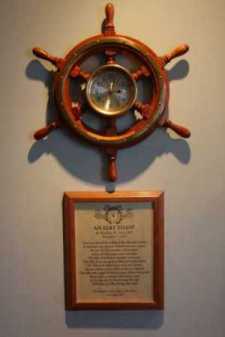 A Ships Wheel clock hangs above an Elks Toast written by PER Matthew Veth, in honor of Our Absent Members.